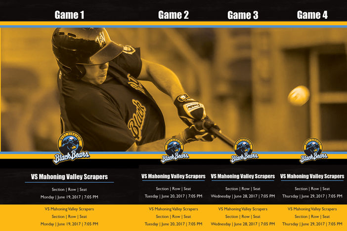 This is the season ticket booklet that was created for the WV Black Bears. The goal for this project was for the front cover to be more illustrative while the inside tickets would be recolored photographs that alternated between the teams colors.
